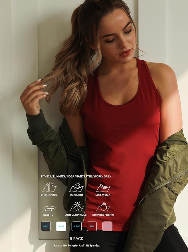 - SUPER VALUE BONUS 5 PACK (Solid): Pack of 5 brilliant color razor back tank tops. You’ll be able to move, bend and stretch as much as your workout requires.