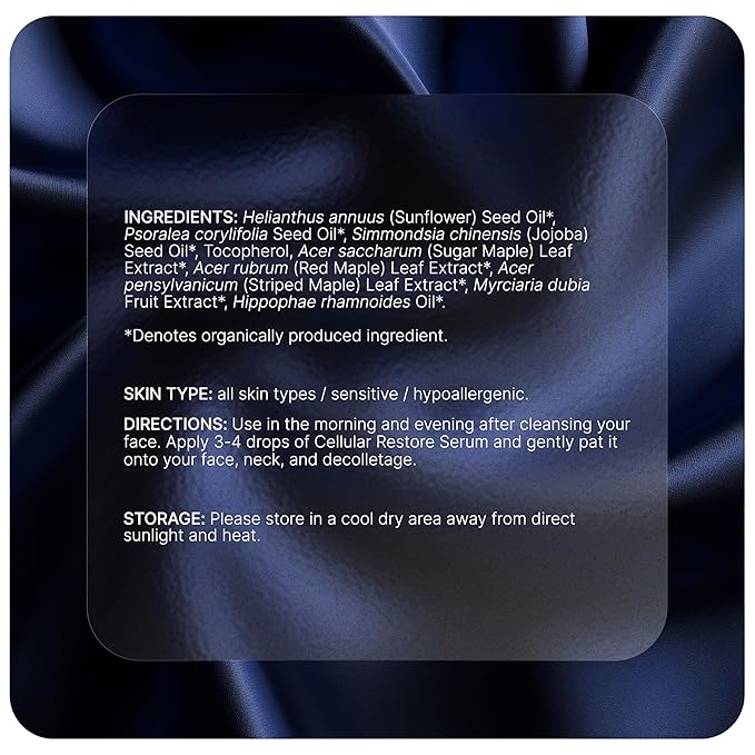 - CLEAN BOTANICAL FORMULA: Cellular Restore features pure babchi oil organic for skin, Vitamin E, and Red Maple extracts in a gentle, plant-based formula suitable for sensitive skin types seeking effective anti-aging care.