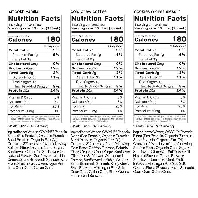 OWYN Only What You Need Plant Based Protein Shake, 20g Vegan Protein from Organic Pumpkin seed, Flax, Pea Blend, Prebiotic supplement, Gluten & Soy-Free (Vanilla Variety Pack, 12 Pack)