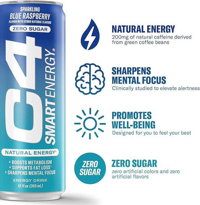Cellucor C4 Smart Energy Drink ‚ Boost Focus and Energy with Zero Sugar, Natural Energy, and Nootropics - 200mg Caffeine - Blue Raspberry (12oz Pack of 12)