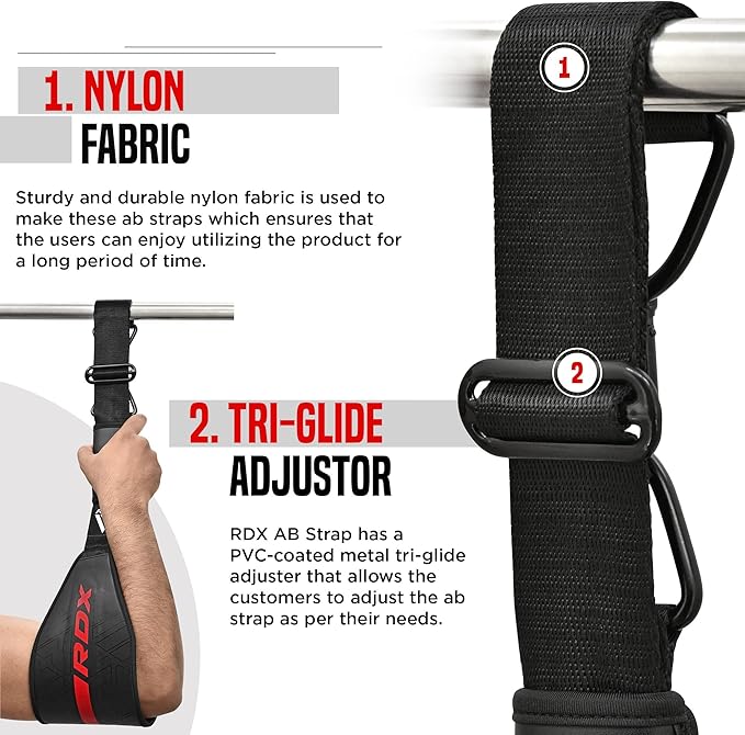 - DISCOVER THE NEOPRENE ADVANTAGE – Engage in extended ab training sessions without discomfort, thanks to the thoughtful design of the RDX workout hanging arm straps. Beneath the sturdy Maya Hide leather, you'll find a soft 6mm inner neoprene padding, offering a cushioned and comfortable feel. This padding not only prevents the pull up straps from digging into the underside of your arms but also allows you to concentrate solely on your ab workouts, eliminating distractions caused by discomfort.