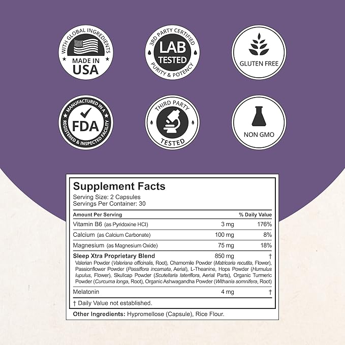 - The Goodness Inside: Proudly manufactured in the USA using naturally-sourced ingredients and the latest technological breakthroughs for quality and value. Sleep Xtra capsules are GMO-free, gluten-free, soy-free, dairy-free, nut-free, egg-free, and suitable for vegans and vegetarians.