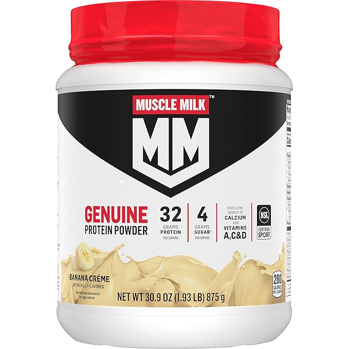 Muscle Milk Genuine Protein Powder, Banana Crème, 1.93 Pounds, 13 Servings, 32g Protein, 4g Sugar, Calcium, Vitamins A, C & D, NSF Certified for Sport, Energizing Snack, Packaging May Vary