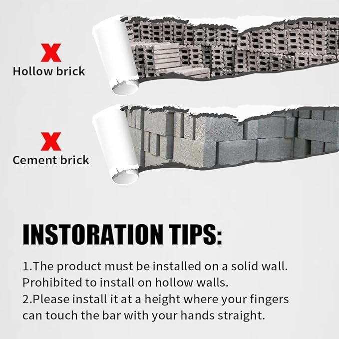 - 【Wall Mounted Pull up Bar】Concrete wall, brick wall or solid tile wall is suggested for mounting this pull up bar and dip station. Please DON'T install it on drywall, honeycomb brick wall, plaster walls, sandwich panel and cavity.