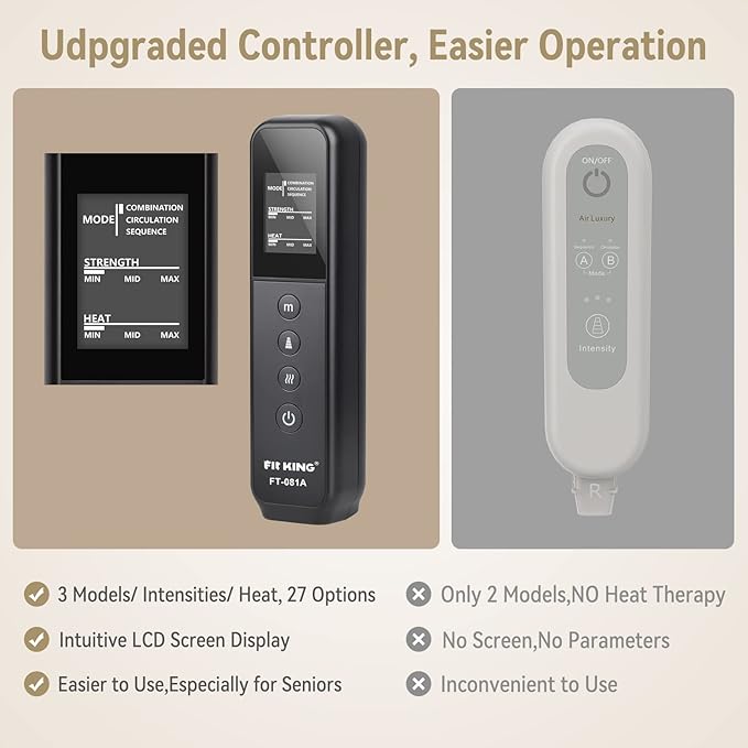 - Upgraded LCD Controller, Easier Operation: The leg massager for circulation with heat comes with upgraded LCD screen handheld controller, clearly display the heat levels, modes and intensities for easy selection. Compared to Velcro models, the zipper design of our sequential compression device is much easier to put on and take off, making it user-friendly, even for seniors