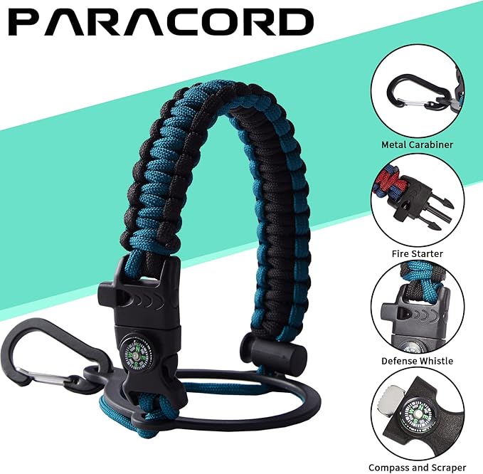 - UNIQUE PARACORD—Perfect Accessories: bright color paracord matches the flask water bottle to give you a youthful vibe while adding a personal style. It comes with a compass, safety loop, metal carabiner, flint, igniter, and whistle to become your survival tool for your wild adventures