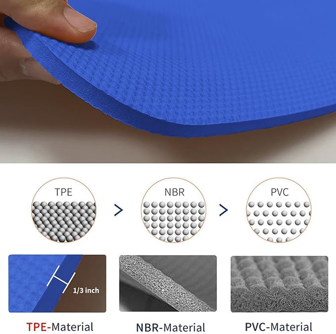 - Eco-friendly TPE Material: More expensive but worth it. TPE is the latest technological improvement to the traditional yoga mats. Our mats are made of SGS certified TPE material which is non-slip, Easy-to-clean odor-less and excellent in cushioning, unlike those cheap & traditional . They are truly eco-friendly, healthy.