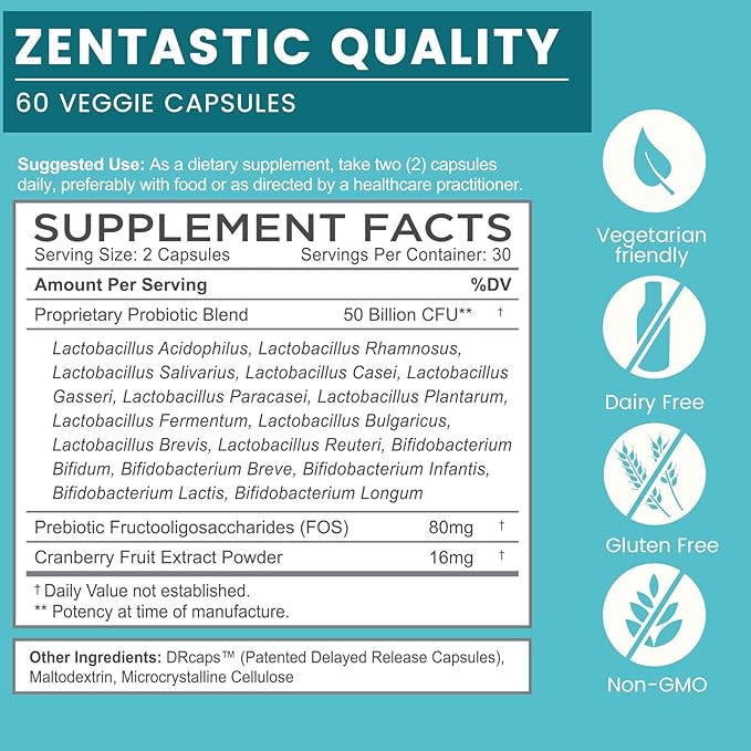 - BALANCED, EFFECTIVE FORMULA: Zentastic Probiotic is powered by 50 billion live cultures and features 16 beneficial strains, including Lactobacillus Acidophilus, to provide broad support for men's and women's overall health. Each veggie capsule also contains prebiotic fuel to empower these good organisms to flourish within the microbiome.*