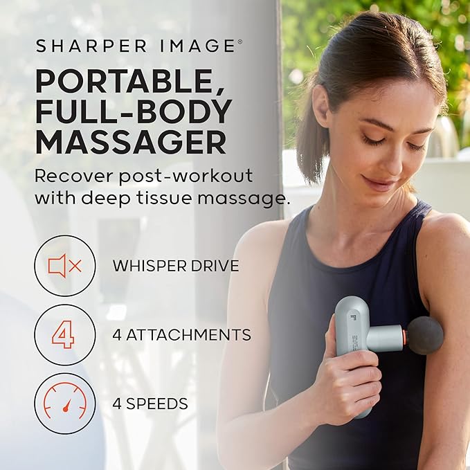 Sharper Image Powerboost Move - Mini Percussion Massage Gun| 4 Attachments, 4 Speeds| Full Body Back & Shoulder Massager| Muscle Recovery & Pain Relief| Deep Tissue Massage Tool| Wellness Gift