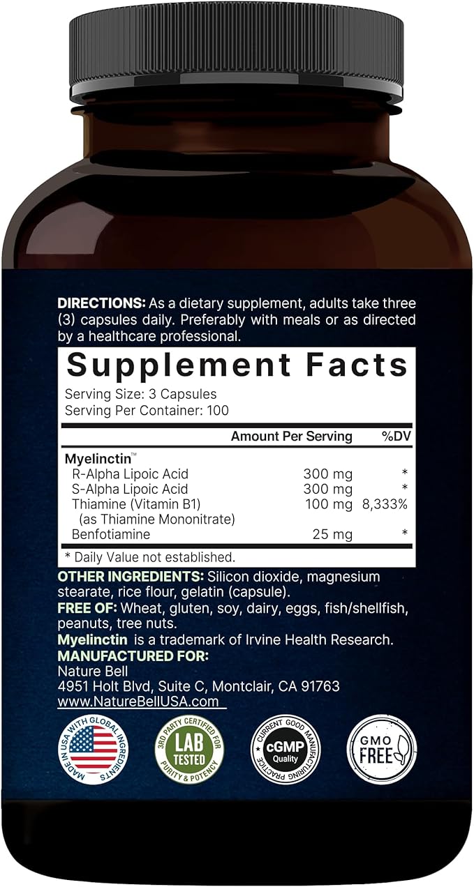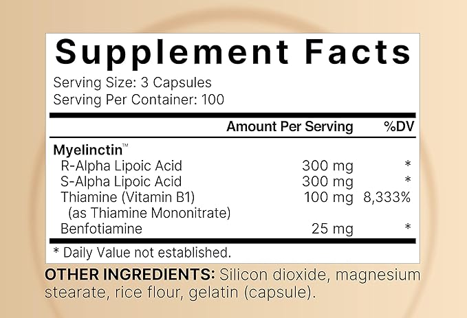 - Efficiently absorbed ALA capsules 600mg with the special Myelinctin formula. A high bioavailable 4-in-1 water and fat soluble combination that includes 300mg R-Alpha Lipoic Acid, 300mg S-Alpha Lipoic Acid plus 100mg Thiamine Mononitrate, and 25mg Benfotiamine.