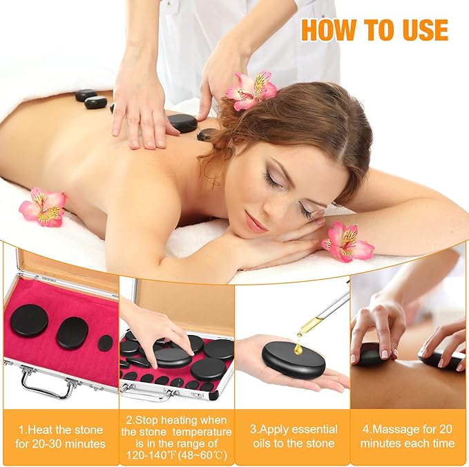 - Gentle Heat for Deep Relaxation: This hot stone massage kit supports stress relief and muscle relaxation. Use with essential oils to help absorption into skin layers, enhance circulation, and ease daily body tension after work or workouts