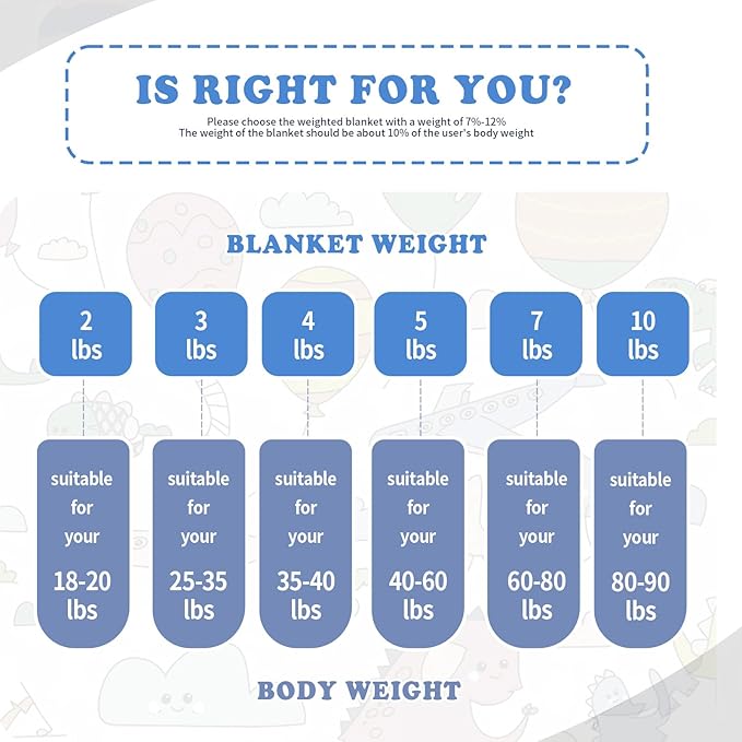 - 【Size Selection】In order to get your premium blanket, pls choose suitable blanket weight based on the body's weight, 8%-12% of body’s weight is the premium choice. Not only helps to avoid you kick off the blanket during sleeping, but can fall asleep quicker and deeper.