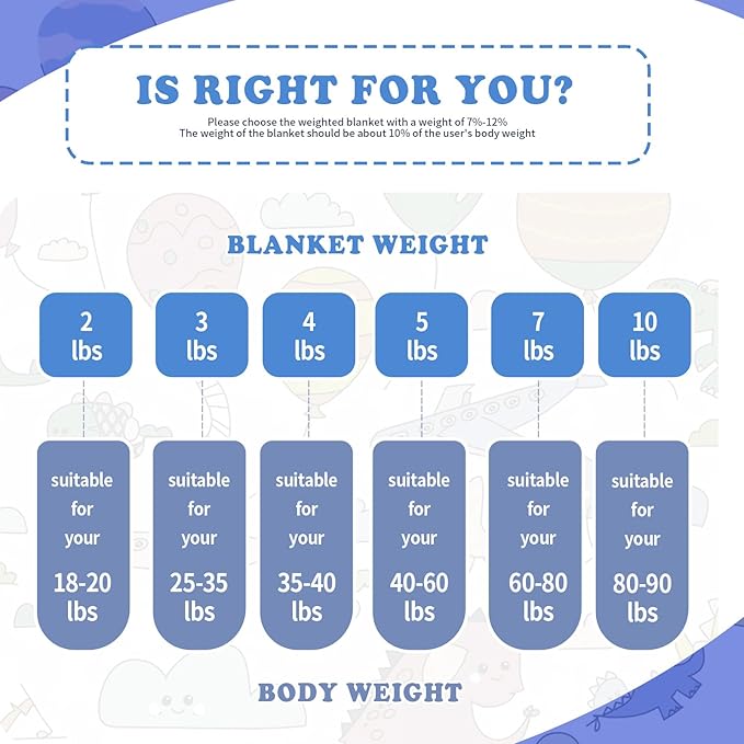 - 【Size Selection】In order to get your premium blanket, pls choose suitable blanket weight based on the body's weight, 8%-12% of body’s weight is the premium choice. Not only helps to avoid you kick off the blanket during sleeping, but can fall asleep quicker and deeper.
