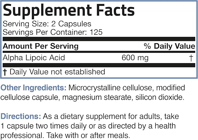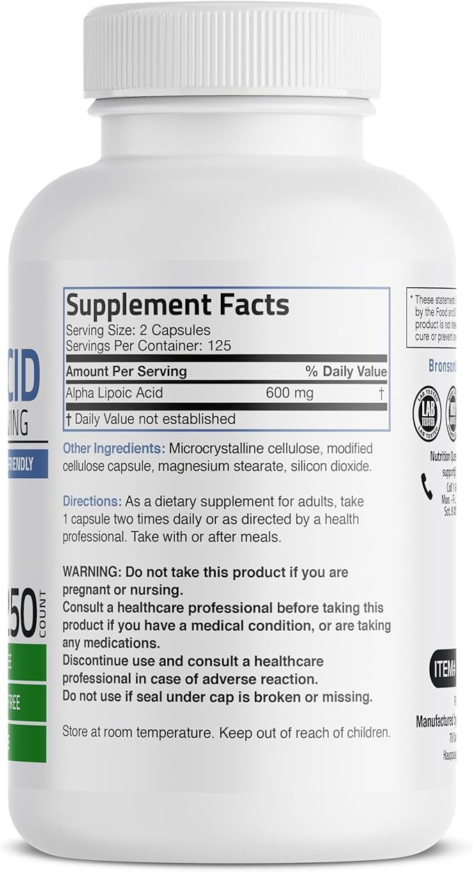 - 600 MG Per Serving: Bronson Alpha Lipoic Acid provides 600 MG per serving (2 vegetarian capsules) to support overall good health and well-being.* Alpha Lipoic Acid 600 MG is vegan/vegetarian friendly and contains no ingredients derived from animals.