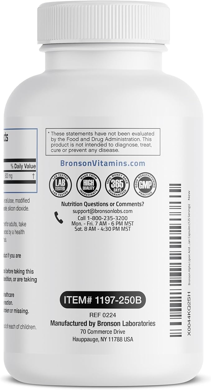 Bronson Alpha Lipoic Acid 600 MG Free Radical Scavenger Supports Health - Non-GMO, 250 Vegetarian Capsules (125 Servings)