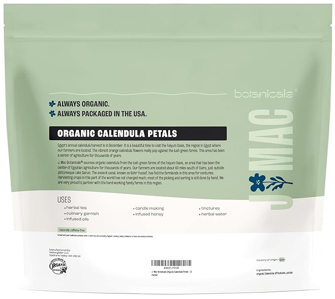 - PACKAGED IN USA ORGANICALLY CERTIFIED FACILITY - 12 ounce bag of bulk organic calendula petals in a high-quality, resealable bag, packaged fresh in Washington State. Certified organic by Organic Certifiers, Inc.