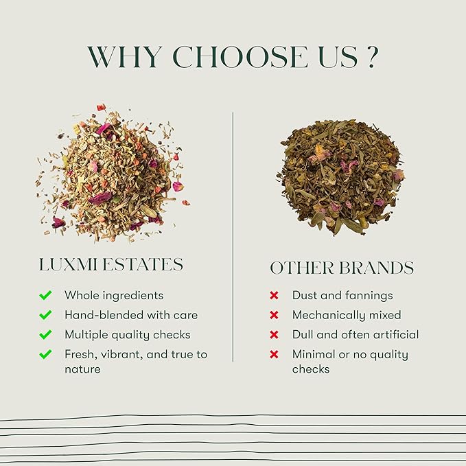 - STRAIGHT FROM THE ESTATE - Since 1912, Luxmi Estates has pioneered the art of crafting tea. Our tea comes straight from our 23 estates across India & Africa, including award-winning, exquisite black, green, white & functional teas designed for focus, sleep, etc. We are committed to giving back, with 1% of all online sales going towards empowering women & communities at our estates.