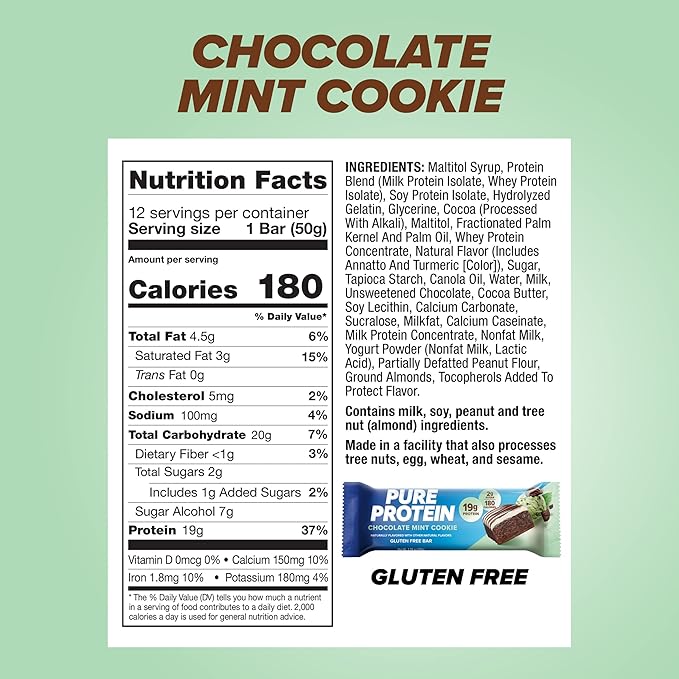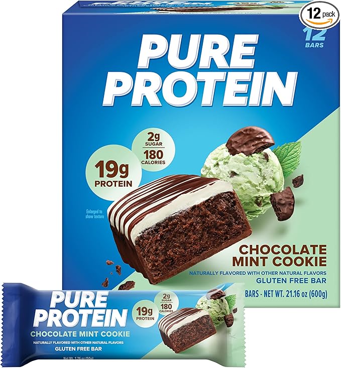 Pure Protein Bars, High Protein, Nutritious Snacks to Support Energy, Low Sugar, Gluten free, Chocolate Mint Cookie,1.76oz, 12 Count (Packaging May Vary)