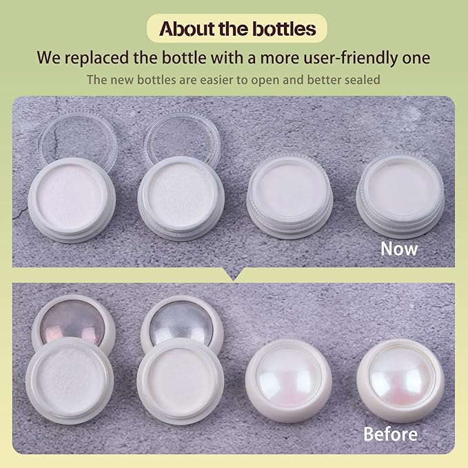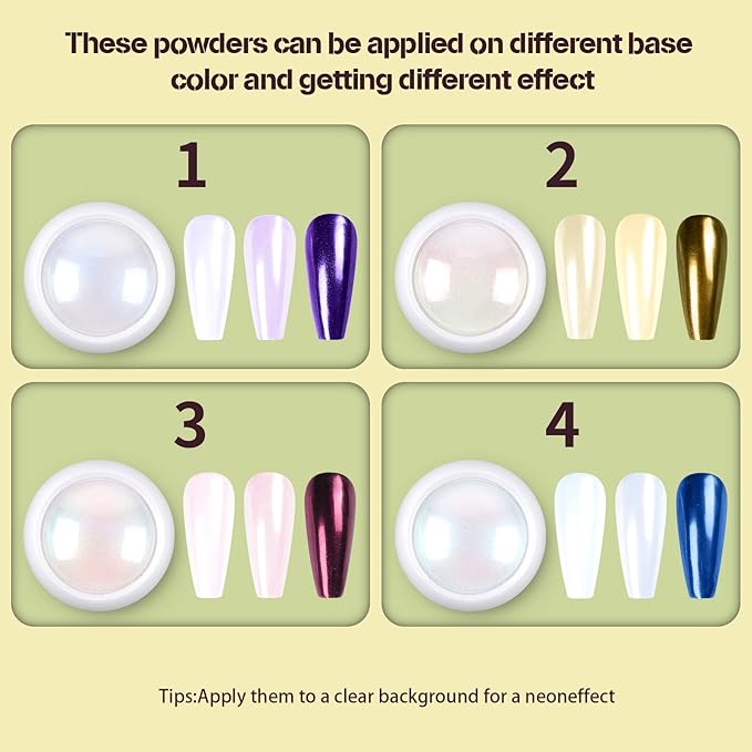 - PACKAGE CONTENTS: 4pcs(each 1gram) chrome nail mirror white pearl pigment powders. It needs to be used with gel nail polish and no wipe top coat.