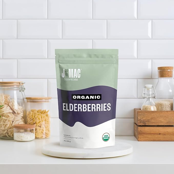 J Mac Botanicals Certified USDA - 100% Organic Dried Elderberries - 1lb Bulk - Non-Irradiated, Non-GMO, Whole Black Elderberry Immune Support - Raw Vegan Sambucus 1 Pound