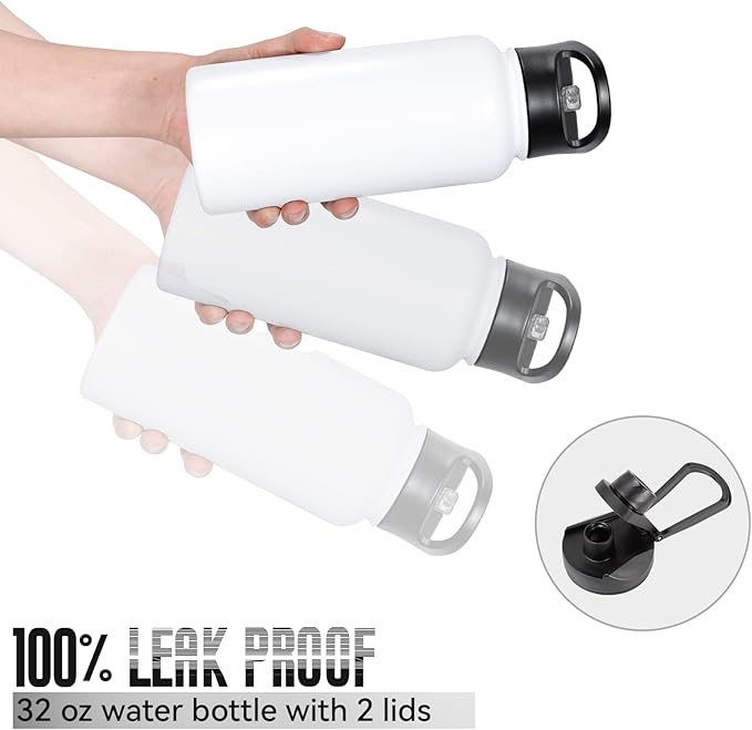 32 oz Insulated Water Bottle with Straw Lid & Wide Mouth Lids, Stainless Steel Sports Water Bottles, Double Walled Vacuum, Leak Proof, White