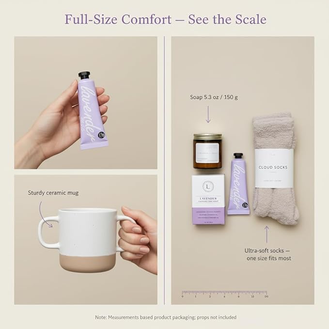 - Premium Spa Essentials in One Gift: Includes a lavender soap bar, hydrating lavender‑sage hand cream, soy wax candle, a lavender bath bomb for a soothing soak, fluffy cozy socks, plus lemon balm & mint tea with a speckled ceramic mug and a ‘Sending Hugs’ card—thoughtfully curated for ultimate self‑care.