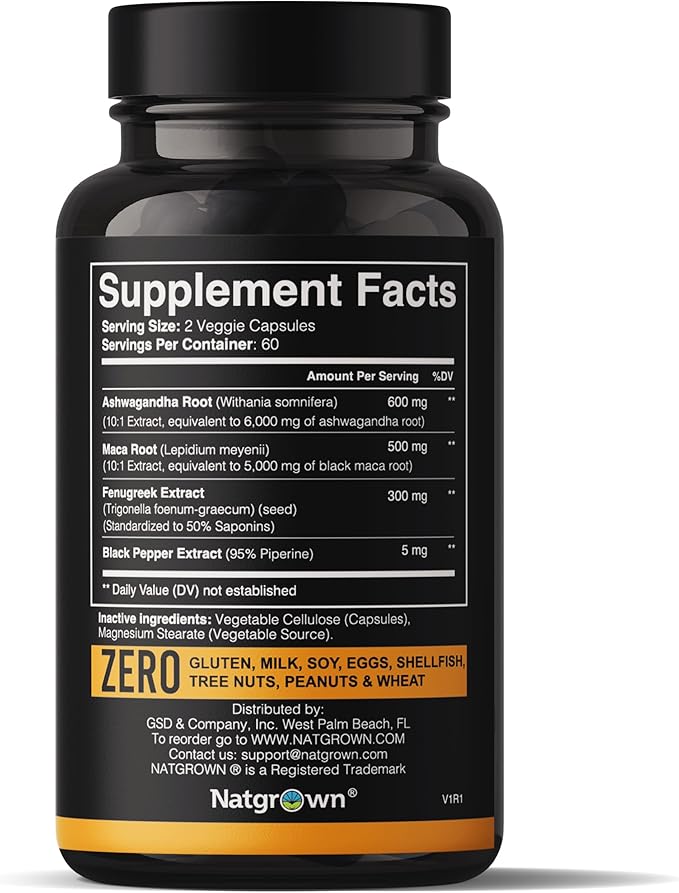 - MADE IN THE USA - Made with Ashwagandha Root (10:1 Extract), Black Maca Root (10:1 Extract), and Fenugreek Extract (Standardized to 50% Saponins). Our products do not contain gluten, milk, soy, tree nuts, peanuts, or wheat.
