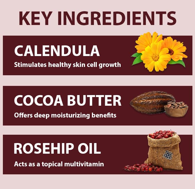- BOTANICAL INGREDIENTS: We’ve made sure to pick top-quality botanical ingredients to create this nourishing moisturizer. The combination of Calendula, Arnica & Rosehip oil creates a soothing feeling and can help in healing damaged skin. Cocoa butter helps in making this moisturizing cream glide right onto your skin, absorb easily, and instantly makes your skin feel silky and smooth.