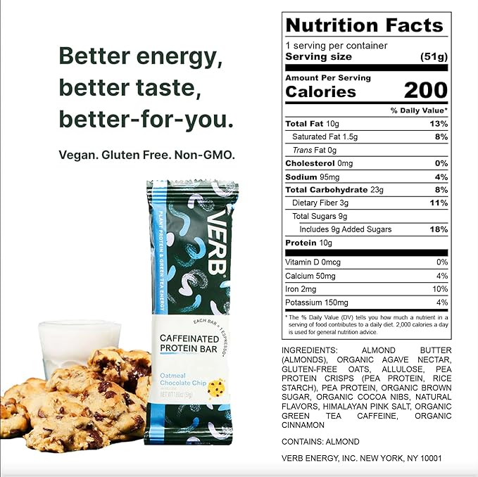 - DELICIOUS OATMEAL CHOCOLATE CHIP PROTEIN BAR: Loved by millions of customers, this is the softest protein bar on the planet! Verb Energy Caffeinated Protein Bars deliver the perfect balance of sweetness and texture, reminiscent of a freshly baked oatmeal chocolate chip cookie. Unlike the dry, chalky, or dense protein bars you’ve tried before, ours are light, moist, and satisfying, crafted by chefs to ensure every bite is bursting with rich chocolatey goodness and comforting oat flavor