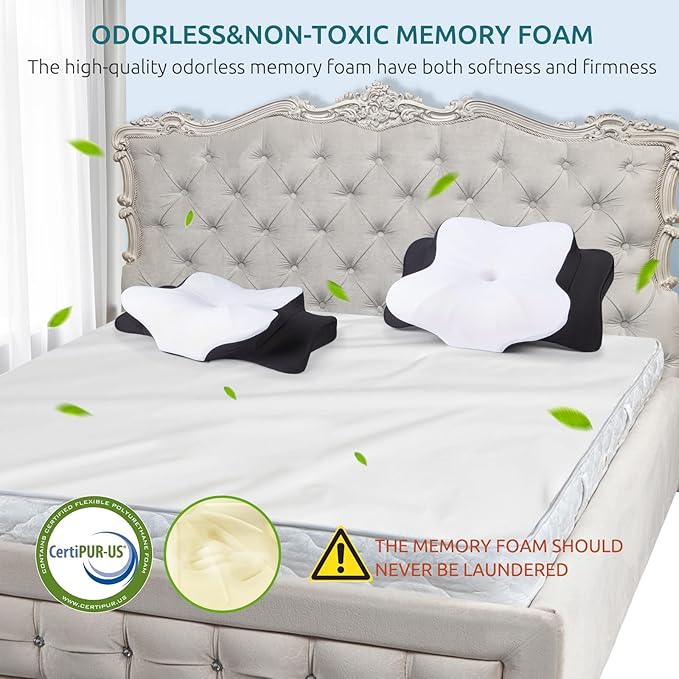 - ๐ใNO NECK PAIN WHILE SLEEPINGใDo you suffer from insomnia all night? Are you waking up with neck cramps or back pain? Our proven ergonomically designed, contoured memory foam pillow supports your head, neck, shoulders and back perfectly. The innovative design allows our pillows to naturally fit your curved spine perfectly, providing proper support for spinal alignment,makes you to shift between positions comfortably.So you will wake up relaxed without any neck and shoulder pain.