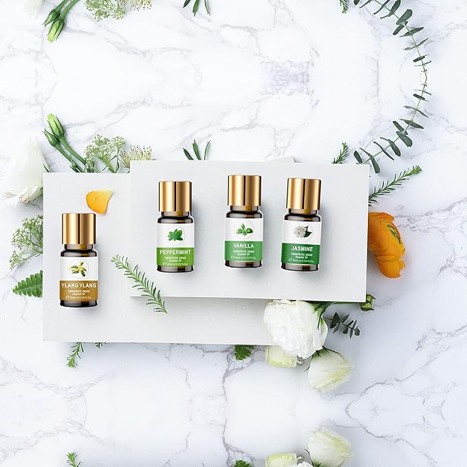 - 8 BOTTLES DIFFERENT FRAGRANCE OIL - - The organic essential oils with 8 different scence, include Ylang Ylang, Patchouli,Osmanthus, Jasmine,Vanilla,Sweet Orange, Peppermint,Lavender .