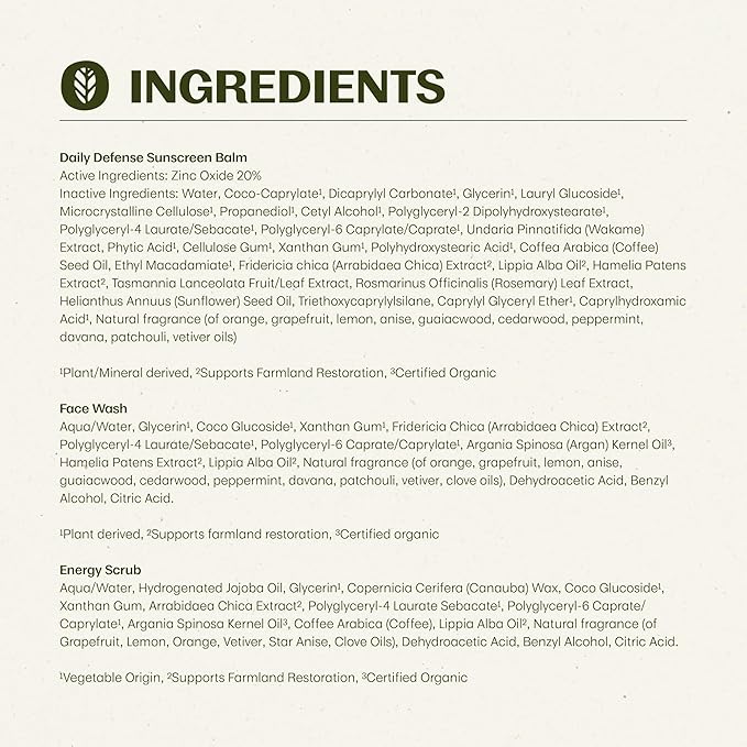 - Build a Better Skin Care Routine: Trio of best-selling skincare products. Daily use mineral SPF for face protects from sun and UV without whiteness or greasiness. Facial wash and exfoliant scrub provide effective, gentle clean after your adventures urban or wild. Powered by unique superplants to keep your skin looking healthy while on the go. Perfect for gifting.