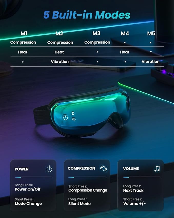 - Please note:1. Utilizing advanced air compression and vibration technology, RENPHO Eyeris 1 eye mask is designed to effectively relax and rejuvenate the eye area.2.The product will cause normal noise <45dB during use 3. You can adjust to low compression when you feel too strong 4. Please find out if you are allergic to protein leather before use. 5.This product is not suitable for individuals who have undergone eye operations, have retina conditions, cataracts, glaucoma, etc.