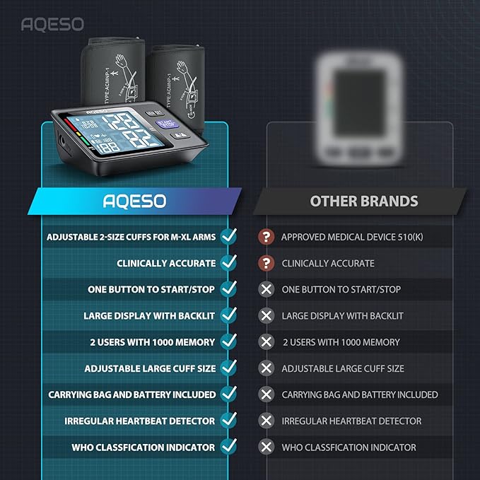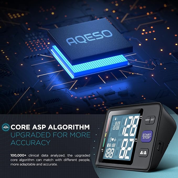 - Accurate & Fast Reading - AQESO automatic blood pressure cuff arm features with upgraded ASP (Accurate Signal Processing) technology. More accurate and faster to get readings within 30s. 100,000+ data are tested for its reliability and calibrated to the best performance. Rest assured to detect hypertension issue by the colorful WHO classification bar.