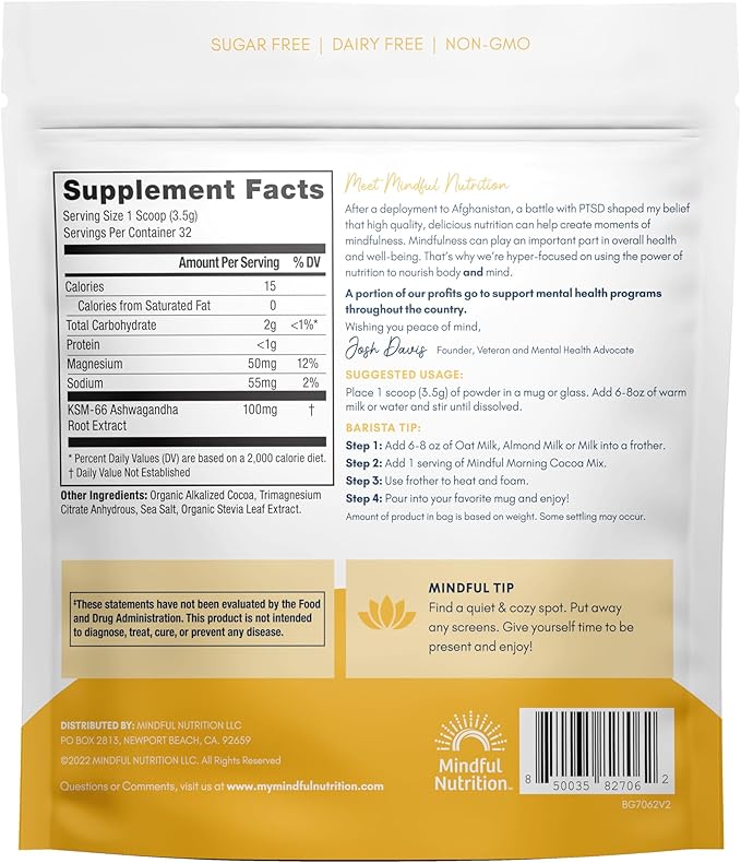 Mindful Morning Sugar Free Hot Chocolate Mix with Organic Ashwagandha and Magnesium Supplements to Relax the Mood and Calm the Mind, Natural Stress Relief Supplement Hot Cocoa