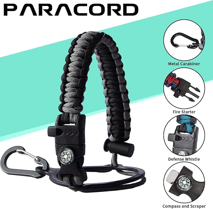 - UNIQUE PARACORD—Perfect Accessories: bright color paracord matches the flask water bottle to give you a youthful vibe while adding a personal style. It comes with a compass, safety loop, metal carabiner, flint, igniter, and whistle to become your survival tool for your wild adventures