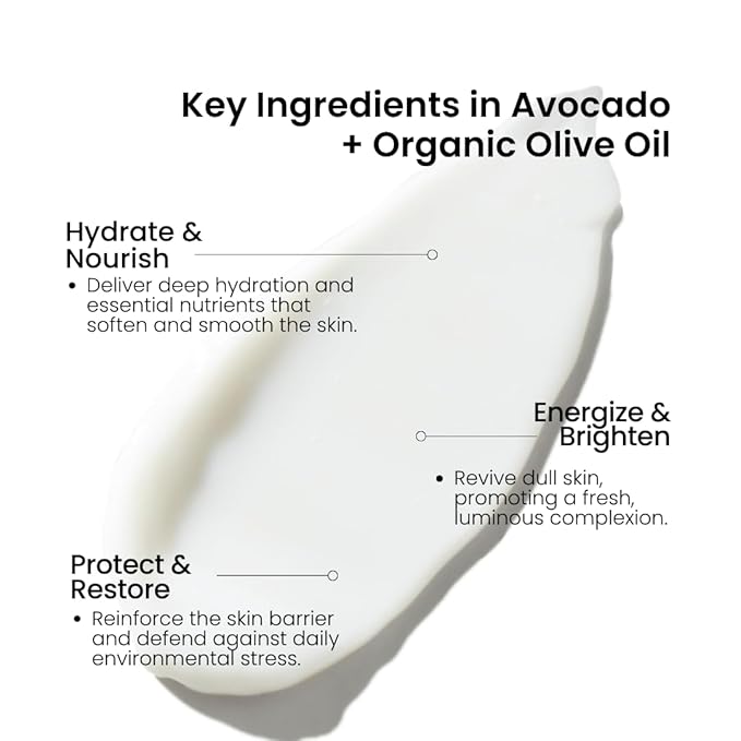 - Antioxidant-Rich Plant-Based Formula – Powered by avocado and olive oil, both rich in essential fatty acids and vitamins to help nourish and protect skin.