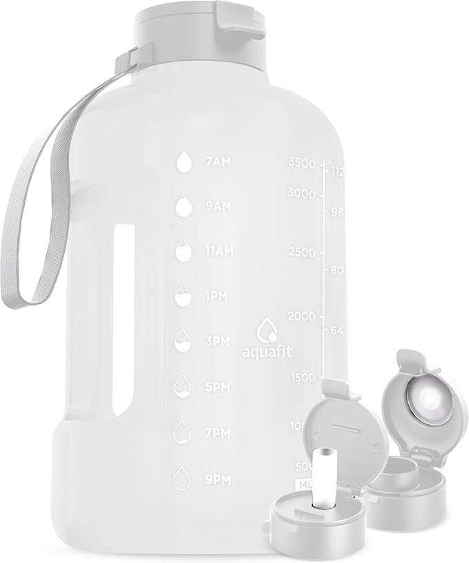 AQUAFIT 1 Gallon Water Bottle with Time Marker - Straw & Chug Lid - BPA Free Gym Water Bottle with Straw - Big Gallon Jug (Frosty, 128 oz - 2 Lids)
