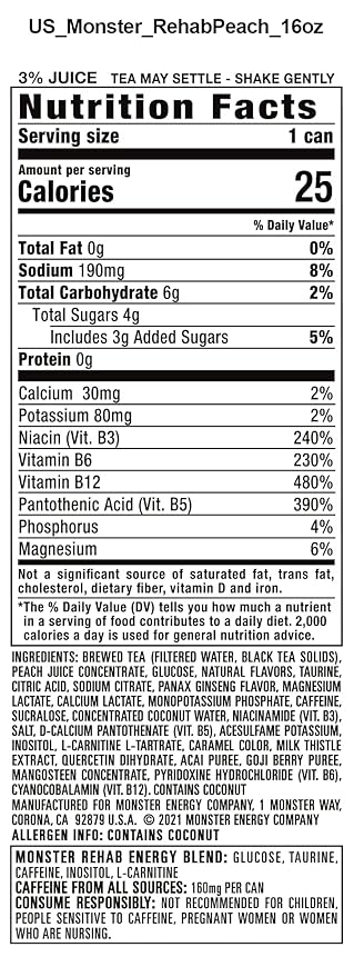 - STOCK UP WITH A 15 PACK: For those looking for an energy drink that’s non carbonated, has only 25 calories per can, and contains Monster Rehab’s Energy Blend, Rehab Monster Peach Tea is available in a convenient 15 pack.