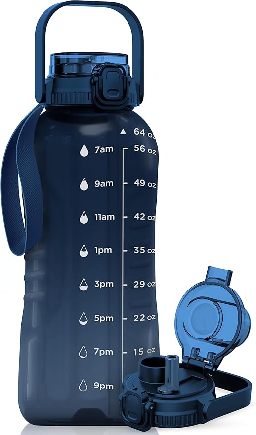 - Half Gallon Water Bottle with Leakproof 2-in1 Lid - Keep your body hydrated with our 64oz water bottle with straw. The lid is designed with a latch that seals the bottle to prevent any leaks on the go. The ergonomic side grip and wrist strap make it easy to carry around. It's the perfect water jug for all your outdoor escapades.
