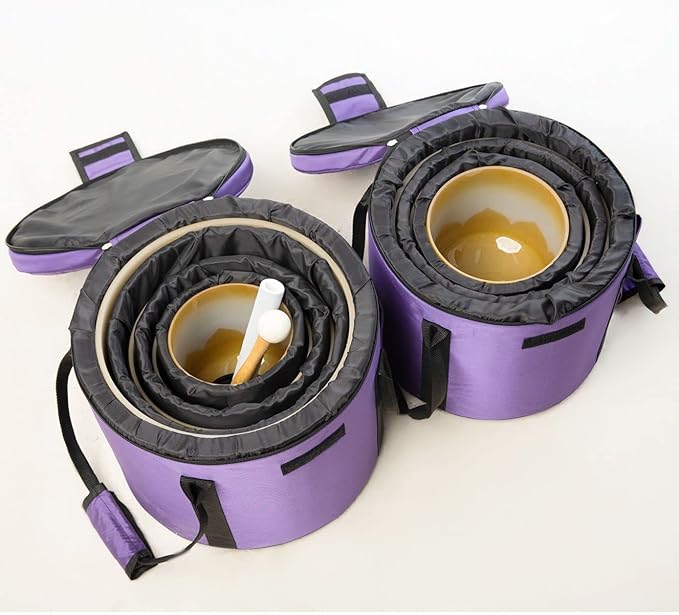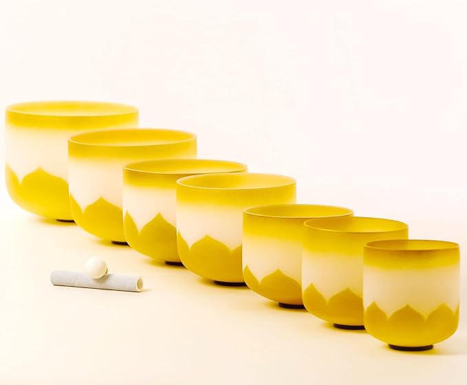 - Package includes: Gold lotus design crystal singing bowl set (1* 6” wide 432hz B Note, 1* 7” wide 432hz A Note, 1* 8” wide 432hz G Note,1* 9” wide 432hz F Note, 1* 10” wide 432hz E Note, 1* 11” wide 432hz D Note, 1* 12” wide 432hz C Note), 1* thick cowhide suede striker, 1* rubber mallet, 7* one O-ring, 2* carrying bags