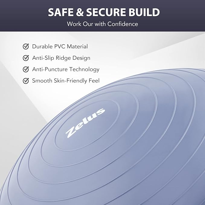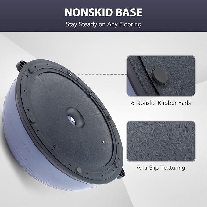- BALL PUMP INCLUDED: A complete combo, this half-dome stability ball comes with a complimentary foot pump that makes it easy to get fully inflated to 9.8” in under 5 minutes. The ball’s high-quality air valve prevents air leakage and extends service life