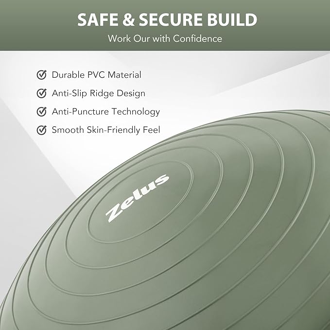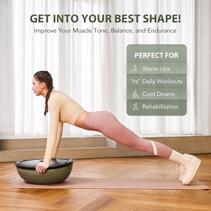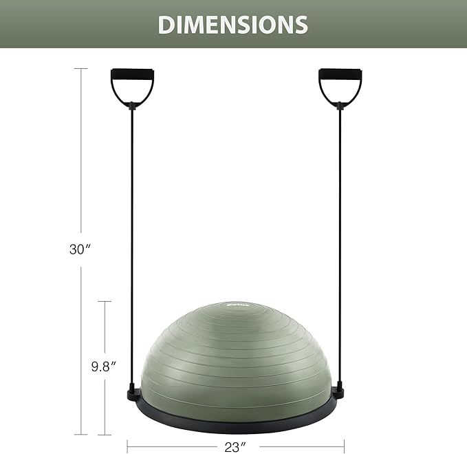 - BALL PUMP INCLUDED: A complete combo, this half-dome stability ball comes with a complimentary foot pump that makes it easy to get fully inflated to 9.8” in under 5 minutes. The ball’s high-quality air valve prevents air leakage and extends service life