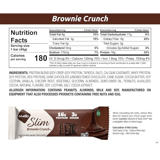- HIGH FIBER & LOW CARB: NuGo Slim contains 6-7g of Fiber and 5-7g of net carbs making it the perfect low carb protein bar. CERTIFIED GLUTEN FREE: NuGo Slim protein bars contain only certified gluten free ingredients.