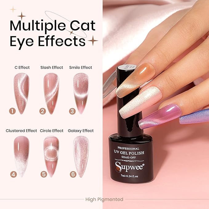 - Warm Tips: Please hold the magnet for 6-10S to get the cat eye effects. Please cure under the UV lamp, curing time depends on the wattage of your lamp