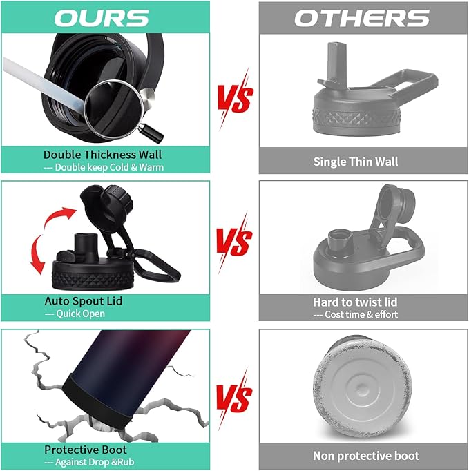 - 2 LEAKPROOF LIDS OPTIONS: The auto spout cap & straw lid provide your different drinking experience. The ONE-HAND operation pop-up spout lid for easy enjoy your fast water flow. The SPILL-PROOF straw lid with high flow rate & BPA free. Both 2 lids design with a sturdy handle, making the Hydrogen flask water bottle more convenient to carry