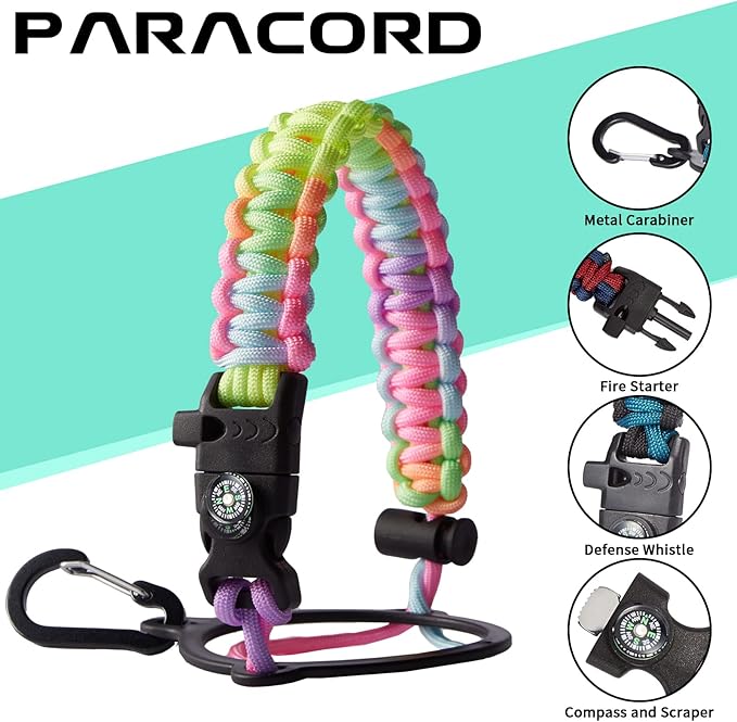 - UNIQUE PARACORD HANDLE: Bright color paracord matches the flask water bottle to give you a youthful vibe while adding a personal style. With a compass, safety loop, metal carabiner, flint, igniter and whistle to become your survival tool, making the 32 oz stainless steel water bottle with paracord an ideal survival kit for expeditions in the wild