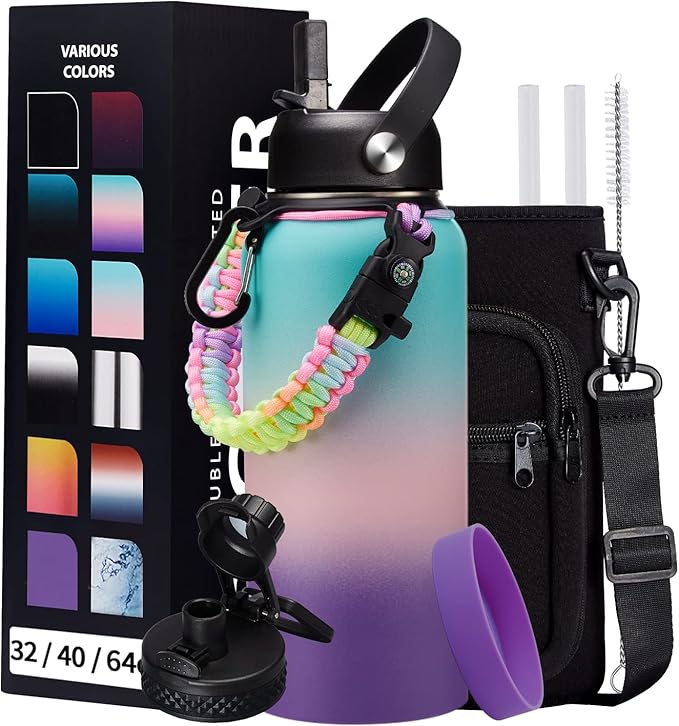 - SUPER JOYFUL COMBO: Buy 32oz insulated water bottles and get 9 accessories (2 x lids, 1 x survival paracord, 1 x carrying pouch, 1 x shoulder strap, 1 x protective cup mat, 2 x straws, 1 x straw brush). WITH A LIFETIME GUARANTEE, these thermal water bottles are perfect gifts for using at home, work, school, road trips, hiking, sporting events, or just hanging out