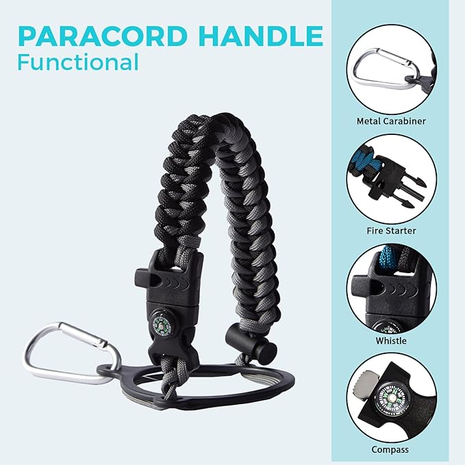 - PERSONALIZATION BOTTLE PARACORD HANDLE - Thermo water bottle with a pretty cool functional paracord handle which does more than meets the eye. The survival strap cord made of military grade nylon, with compass, safety loop, metal carabiner, flint, igniter and whistle. Can help you out if you were in a survival situation while hiking, camping or everyday life