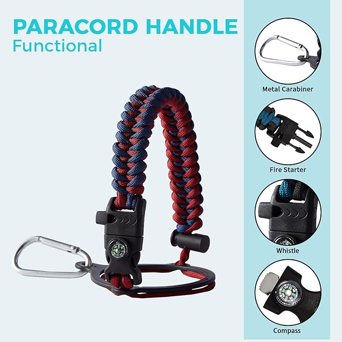 - PERSONALIZATION BOTTLE PARACORD HANDLE - Thermo water bottle with a pretty cool functional paracord handle which does more than meets the eye. The survival strap cord made of military grade nylon, with compass, safety loop, metal carabiner, flint, igniter and whistle. Can help you out if you were in a survival situation while hiking, camping or everyday life